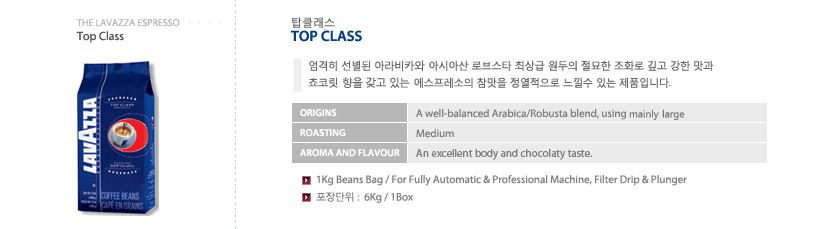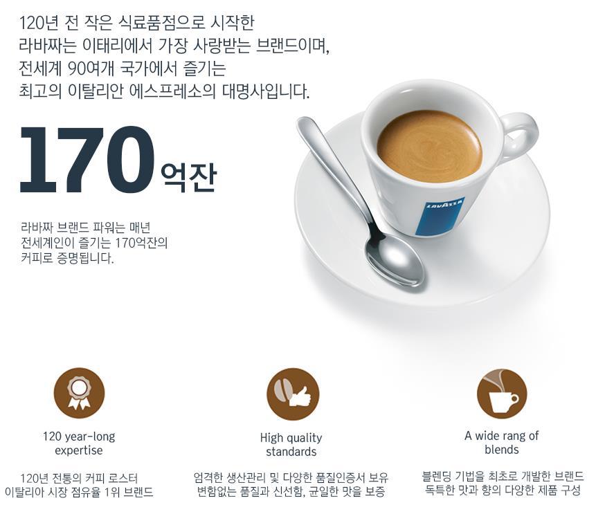 1895년 이태리 토리노 지방에서 '루이지라바짜' 에 의해 시작된 라바짜 커피는 오랜 역사와 전통으로 유럽에서 가장 널리 알려진 브랜드이며, 그 맛은 이미 예술의 경지에 이르렀다는 찬사를 받고 있습니다. 정통 에스프레소 커피로서 최고급 브랜드라 는 명성과 함께 이태리뿐 아니라 유럽 전체에서 최고의 시장 점유율을 차지할 만큼 대중적인 인기를 누리고 있는 라바짜 커피 의 신화는 라바짜 가문의 4대에 걸친 지속적 투자와 기술 개선으로 일구어낸 결과입니다.
